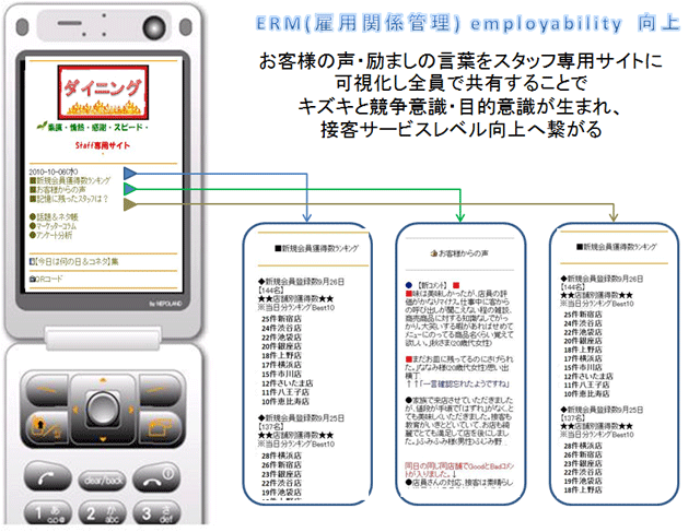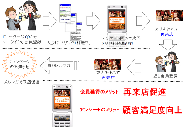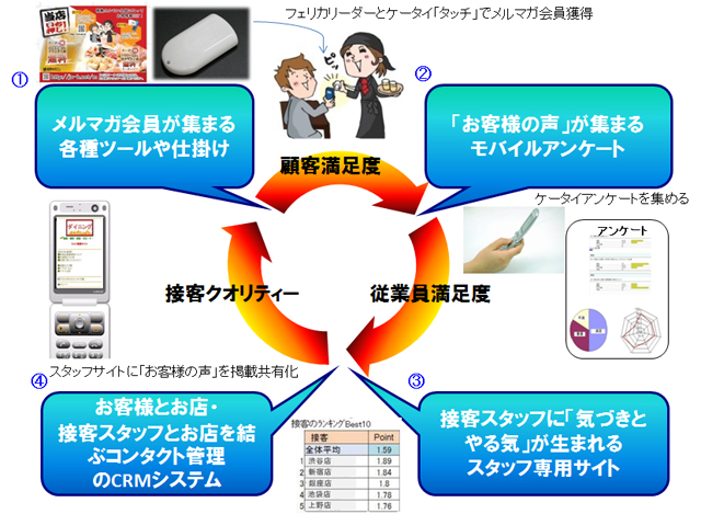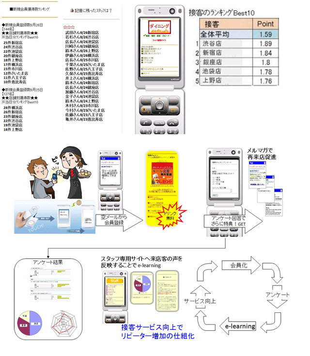 モバイルとCRMシステムを使いお客様との適正なコンタクト管理にて再来店促進を行います。さらに来店者アンケートとケータイ版スタッフ専用サイトを使い「お客様の声」を可視化・共有することで接客スキル向上を図るサポートを行います。