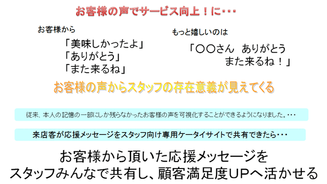 接客における顧客満足度を高め、お店のファンを増やしリピート率を高める仕組みとして、[モバイルCRMシステム]と[独自のマーケティング手法]を組み合わせ、チェーン店の現場利用にて蓄積されたノウハウから生まれたパッケージサービスです。